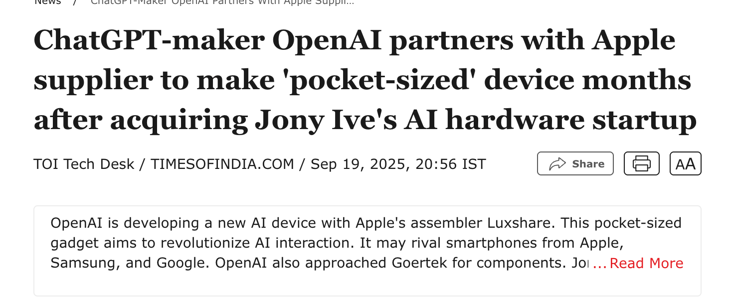 【環球網科技綜合報道】9月20日消息,據多家外媒報道稱,OpenAI正以驚人速度推進消費級硬件戰略,通過大規模招募蘋果核心硬件人才、聯手立訊精密等供應鏈巨頭,加速構建AI原生硬件生態。