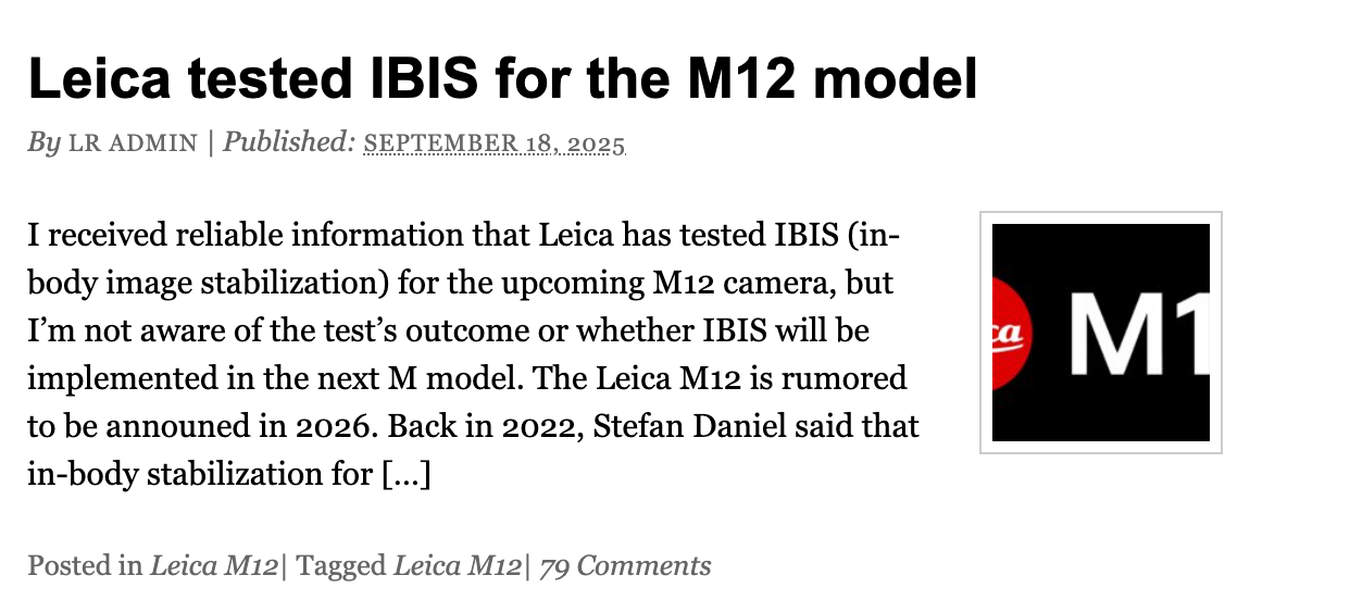 【環球網科技綜合報道】9月20日消息,據外媒LeicaRumors報道,在徠卡M11-V即將發佈之際,徠卡公司正緊鑼密鼓測試新一代M12原型機。該機型最大亮點在於可能首次搭載機身防抖(IBIS)功能,這一技術革新有望徹底改變徠卡M系列在暗光環境下的拍攝體驗。