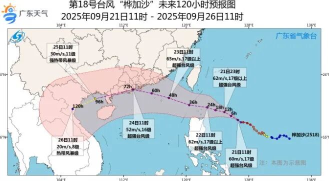 據@廣東天氣,9月21日17時,今年第18號颱風“樺加沙”(超強颱風級)中心位於北緯18點6度,東經125點8度,也就是在距離菲律賓馬尼拉東偏北方向約680公里的西北太平洋洋麪上,中心附近最大風力17級,達到60米/秒的風速,中心最低氣壓920百帕。