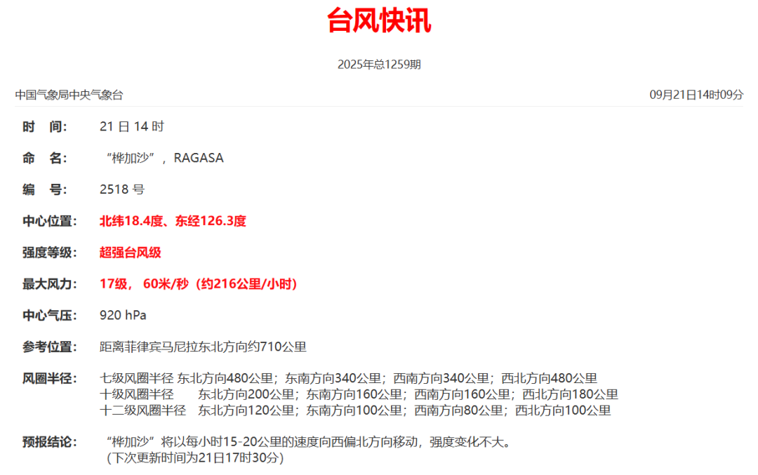 根據上述預報和國省市會商研判意見,“樺加沙”具有極端性,強度極強、破壞性極強,深圳市氣象台預計將在21日下午至23日夜間陸續發佈颱風白色、藍色、黃色、橙色、紅色預警信號,23日夜間到24日是風雨最強時段,陸地最大陣風可達12-14級,沿海、海區和高地最大陣風可達15-17級,深圳(含深汕)23-25日將有全市性大暴雨局部特大暴雨,需提前做好巨災防禦準備。