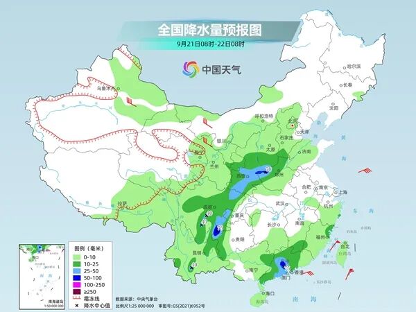 今明兩天(9月21日至22日),華西秋雨再度發展,四川、陝西等地部分地區有暴雨,需注意防範連續降雨可能引發的次生災害。此外,今年第18號颱風“樺加沙”23日將進入南海海域,華南多地再迎強風雨天氣,公眾請關注臨近預報信息,及時做好颱風防禦措施。