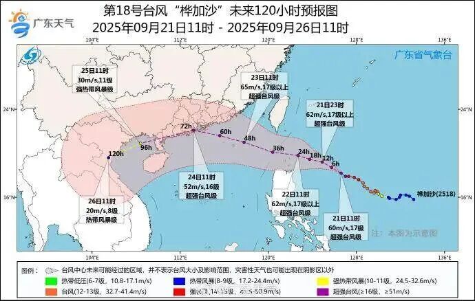 廣東省氣象台9月21日預計,“樺加沙”將以20公里左右的時速向西北方向移動,強度還將有所增強,9月22日夜間穿過巴士海峽,9月23日凌晨進入南海東北部海面,趨向廣東海面,*9月23日至25日嚴重影響廣東海面和陸地,並有可能於24日前後(較大可能24日凌晨至下午)以強颱風級或超強颱風級(14-16級)在廣東中西部沿海地區登陸。*預計“樺加沙”在靠近廣東沿海偏西行時,離岸距離近,存在隨時登陸、多次登陸的可能,因而登陸時間和地點仍有較大不確定性。