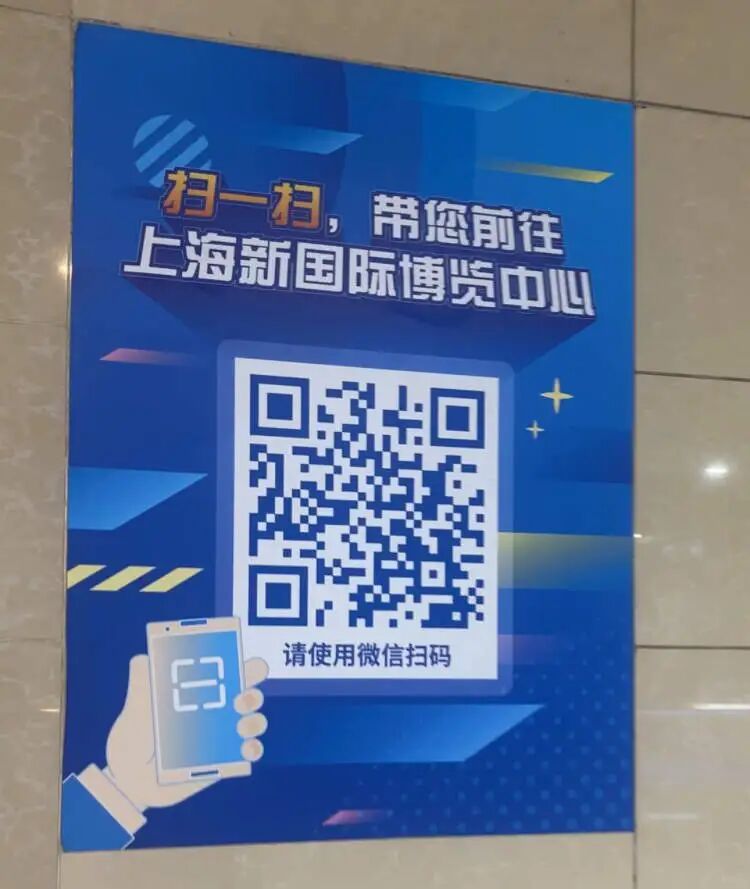 據介紹,遇到新國際博覽中心開展會,龍陽路站人流量巨大,工作人員不僅要引導人流,還要提供指路等服務,由此,樞紐站在2號口附近張貼了指路二維碼,提供從2號口到新國際博覽中心的VR實景導航。