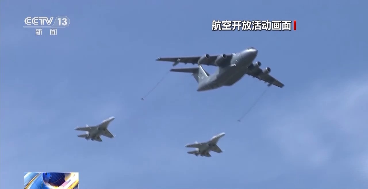 在飛行表演環節,運油-20A加油運輸機與殲-16戰鬥機在空中組成編隊飛行。隨着運油-20A加油軟管平穩伸出,三機精準完成對接,呈現了一場高難度的空中加油演示,展現出運-20平台出色的多任務擴展能力。