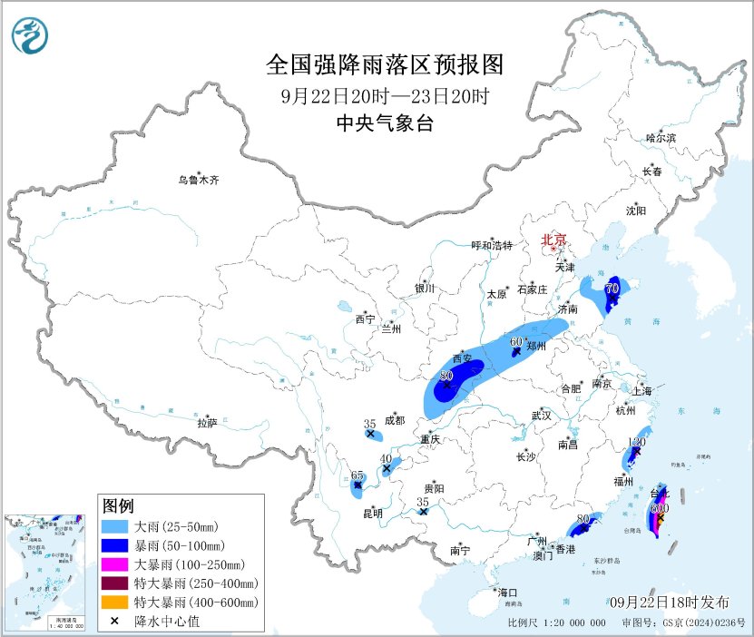 預計,9月22日20時至23日20時,四川盆地東北部和西南部、陝西南部、山西南部、河南中北部、山東西部和東部、浙江東南部、福建南部和東北部、廣東東南部、台灣島等地部分地區有大到暴雨,其中,浙江東南部、福建東北部、台灣島東部等地部分地區有大暴雨,台灣島東部局地特大暴雨(250~600毫米)(見圖2)。中央氣象台9月22日18時發佈暴雨藍色預警。