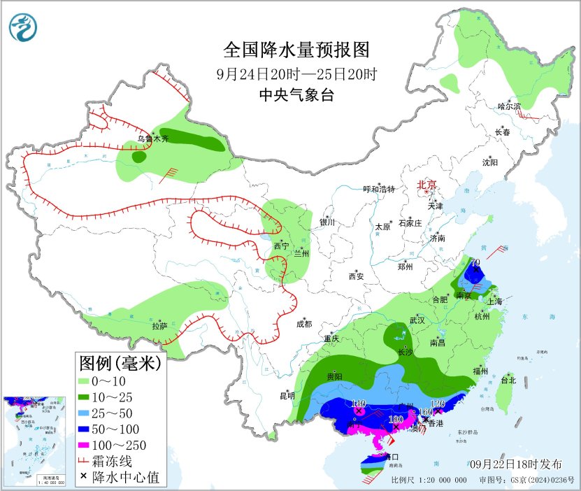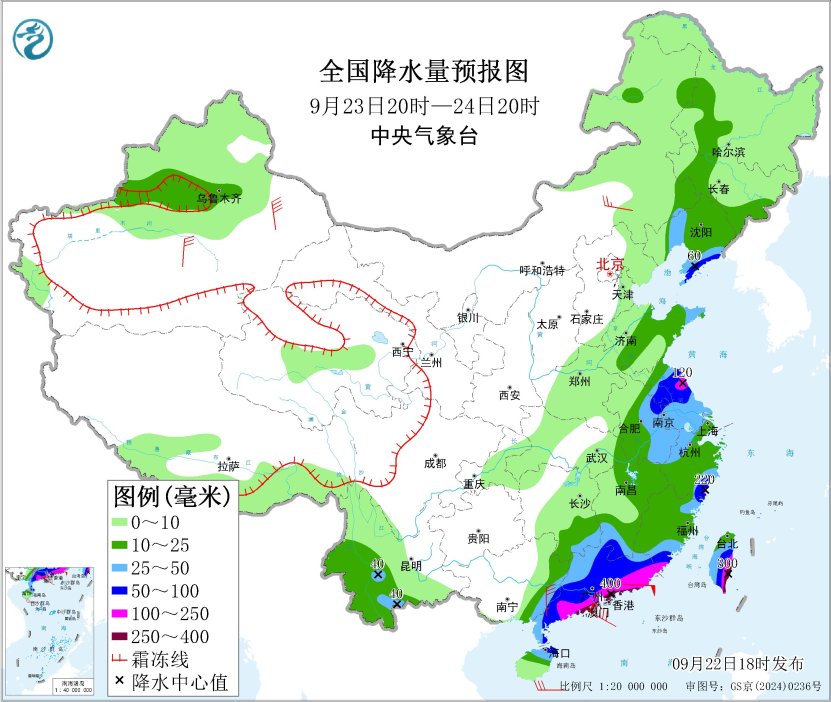 *9月23日20時至24日20時,*遼東半島、江淮東部和南部、華南中東部、台灣島大部等地部分地區有大到暴雨,其中,江蘇東北部、福建東南部、廣東南部沿海、台灣島東南部等地部分地區有大暴雨,廣東南部沿海、台灣島東南部等地局地特大暴雨(250~400毫米)。內蒙古東南部、新疆南疆盆地、廣西東部等地部分地區有4~6級風,新疆東部、海南島部分地區有6~7級風,廣東東南部沿海部分地區有7~8級風。南海北部海域將有14~16級大風、陣風17級以上,台灣海峽、渤海海峽將有6~8級大風、陣風9級,瓊州海峽、南海南部海域、黃海中北部海域、東海南部海域、台灣以東洋麪、巴士海峽、北部灣、南海中西部將有5~7級大風、陣風8級(見圖4)。