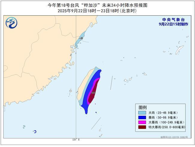 *降水預報:*22日18時至23日18時,福建東北部、浙江東南部局地、台灣島中東部有大到暴雨,台灣島東部有大暴雨,局地特大暴雨(250-600毫米)。