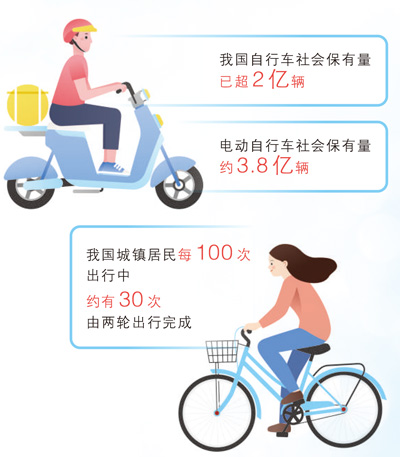 中國自行車協會數據顯示,目前,我國自行車社會保有量已超2億輛,電動自行車社會保有量約3.8億輛。我國城鎮居民每100次出行中,約有30次由兩輪出行完成。