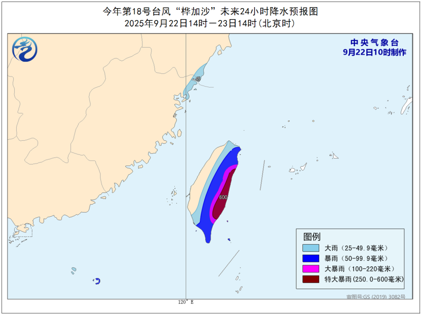 *降水預報:*22日14時至23日14時,福建東北部和浙江東南部局地有大雨,台灣島中東部有大到暴雨,台灣島東部有大暴雨,局地特大暴雨(250~600毫米)。來源:中央氣象台