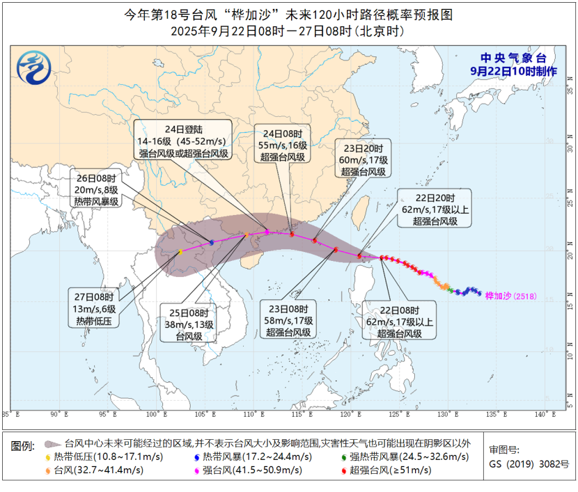 大風預報:22日14時至23日14時,巴士海峽、南海東北部海域、台灣海峽、台灣以東洋麪、東海西南部海域、東沙羣島、福建沿海、廣東東部沿海、台灣島沿海將有7-9級、陣風10-11級大風,其中,巴士海峽、南海東北部的部分海域風力有10-13級、陣風14-15級,颱風中心經過的附近海域或地區風力可達14-17級、陣風17級以上。