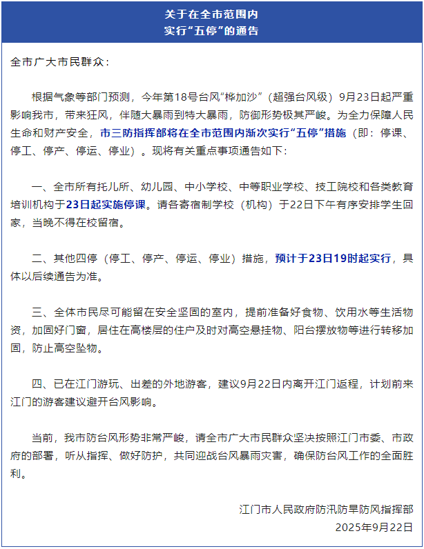 根據氣象等部門預測,今年第18號颱風“樺加沙”(超強颱風級)9月23日起嚴重影響我市,帶來狂風,伴隨大暴雨到特大暴雨,防禦形勢極其嚴峻。為全力保障人民生命和財產安全,市三防指揮部將在全市範圍內漸次實行“五停”措施(即:停課、停工、停產、停運、停業)。現將有關重點事項通告如下: