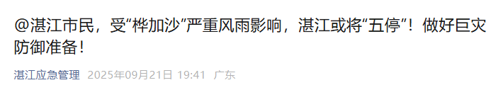 21日,湛江應急管理發佈消息稱,受颱風影響期間,湛江將根據受影響程度視情采取“五停”防颱風措施(即:停課、停工、停產、停運、停業)的一項或多項措施,請市民密切關注氣象預警信息,做好防風防水浸準備,儲備應急物品、食物,加固門窗和懸掛物。