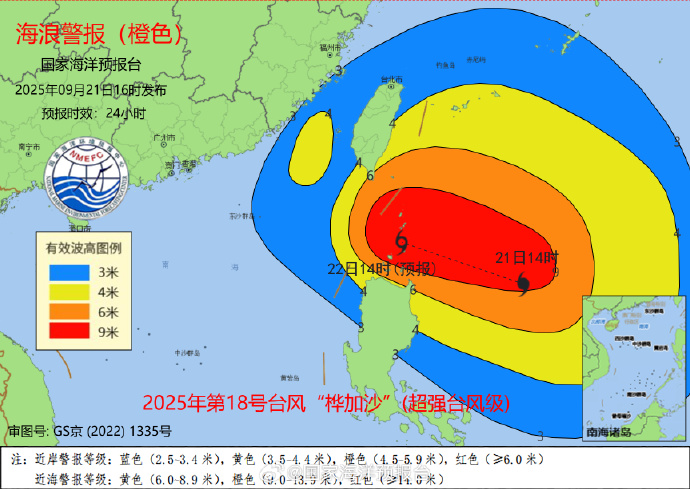 預計:9月22日凌晨到下午,巴士海峽將出現6到13米的狂浪到狂濤區,台灣以東洋麪將出現5到7米的巨浪到狂浪區,台灣海峽、南海東北部將出現3到4.5米的大浪到巨浪區,近海海域海浪預警級別為橙色;福建、浙江南部近岸海域將出現2到3米的中浪到大浪,近岸海域海浪預警級別為藍色。請在上述海域作業的船隻注意安全,沿海各有關單位提前採取防浪避浪措施。
