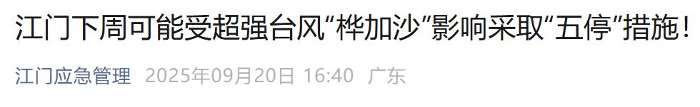 20日,“江門應急管理”發文稱:因為“樺加沙”巔峯強度非常強,並且23日至24日北方有冷空氣南下,非常容易引發激烈的風雨天氣。江門本週可能受影響採取“五停”措施,請市民密切關注氣象預警信息,做好防颱準備。