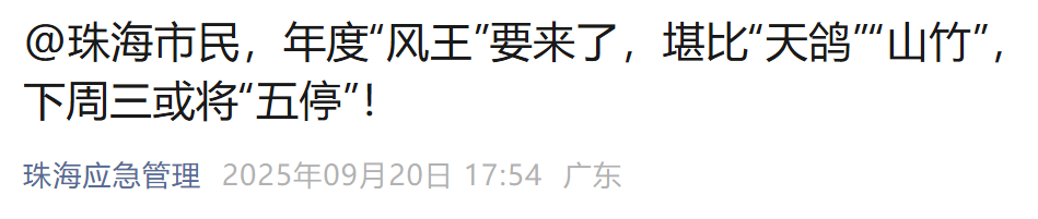 20日,“珠海應急管理”發文稱:按照現時預測,本週二、週三,天氣逐漸轉壞,週三天氣惡劣,有狂風大驟雨及雷暴。由於受顯著風暴潮影響,屆時沿岸水位可能與2017年的“天鴿”及2018年的“山竹”相若。