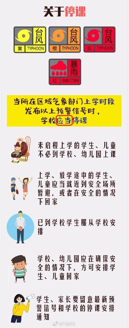 根據《廣州市公眾應對主要氣象災害指引》和《廣州市教育系統應對台風、暴雨災害天氣指引》,當所在區域發佈颱風黃色及以上級別預警信號時,應當停課。