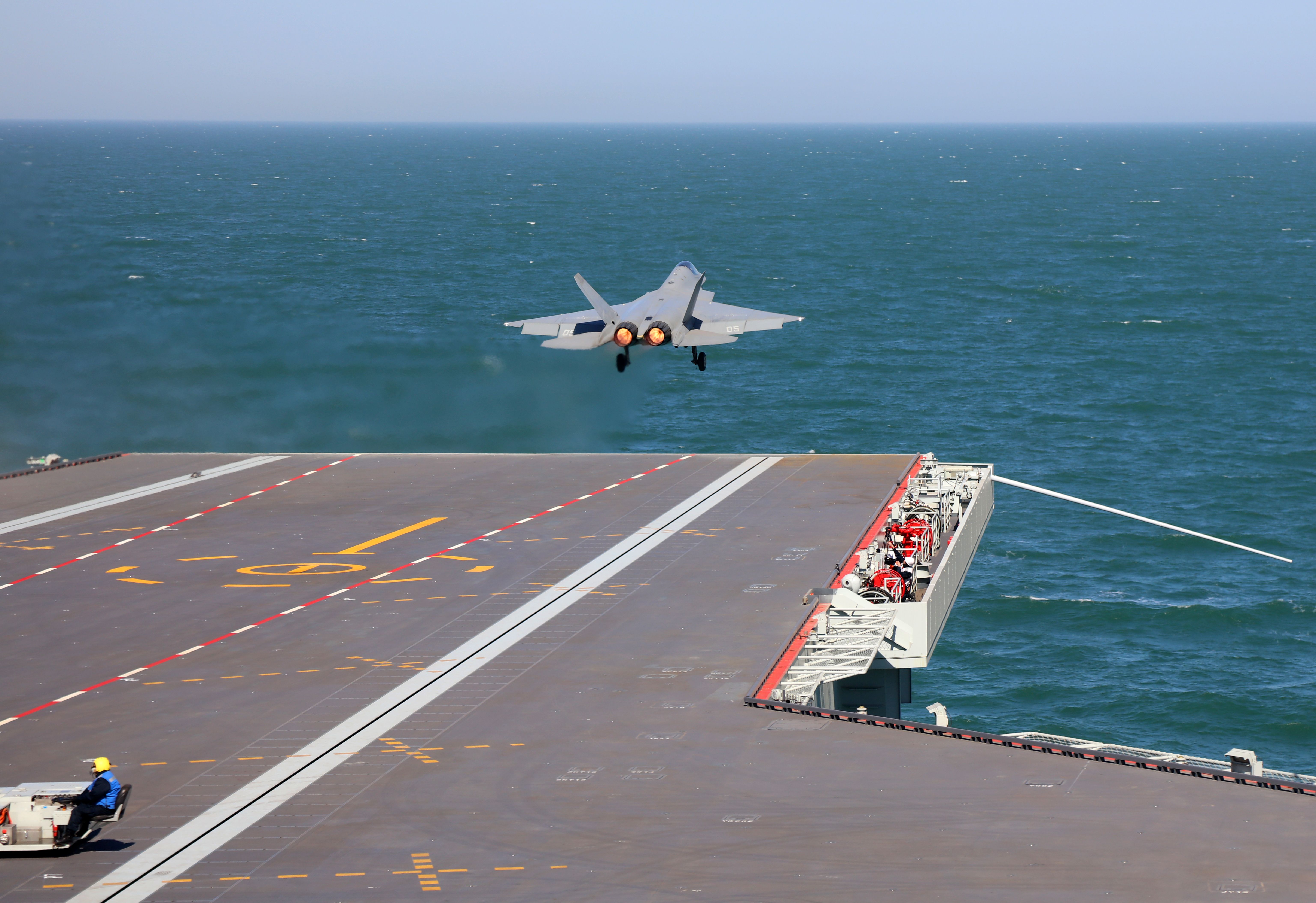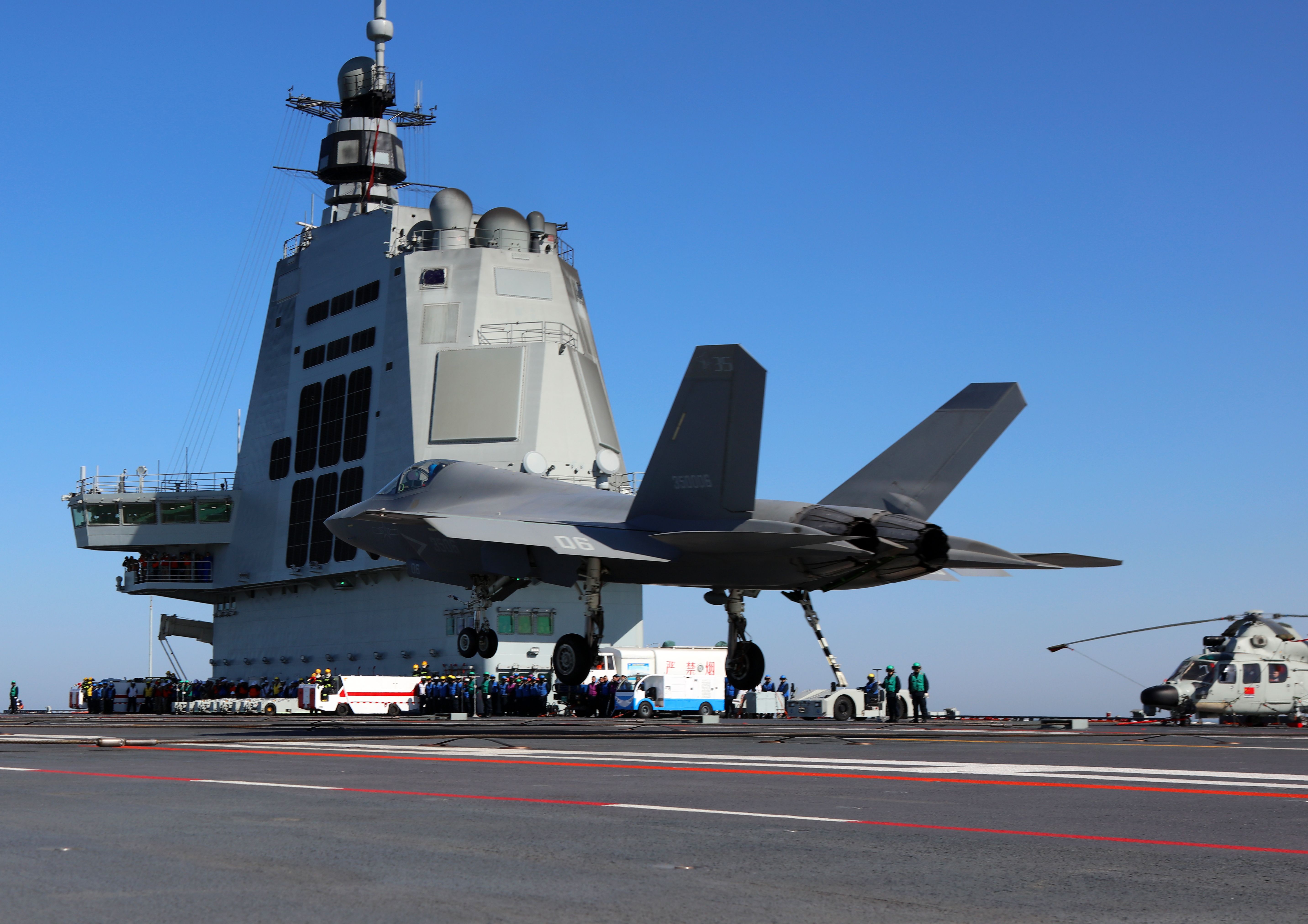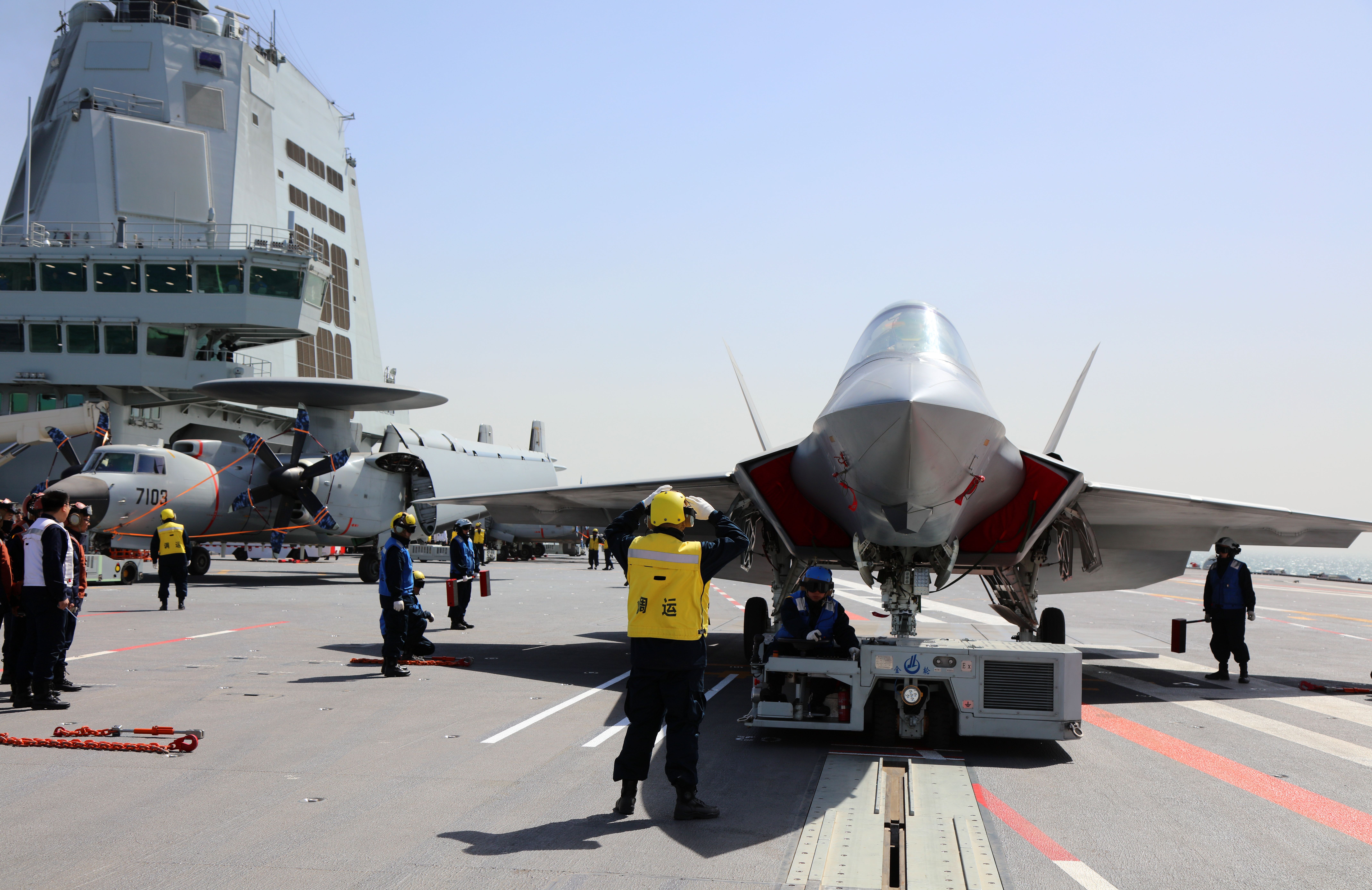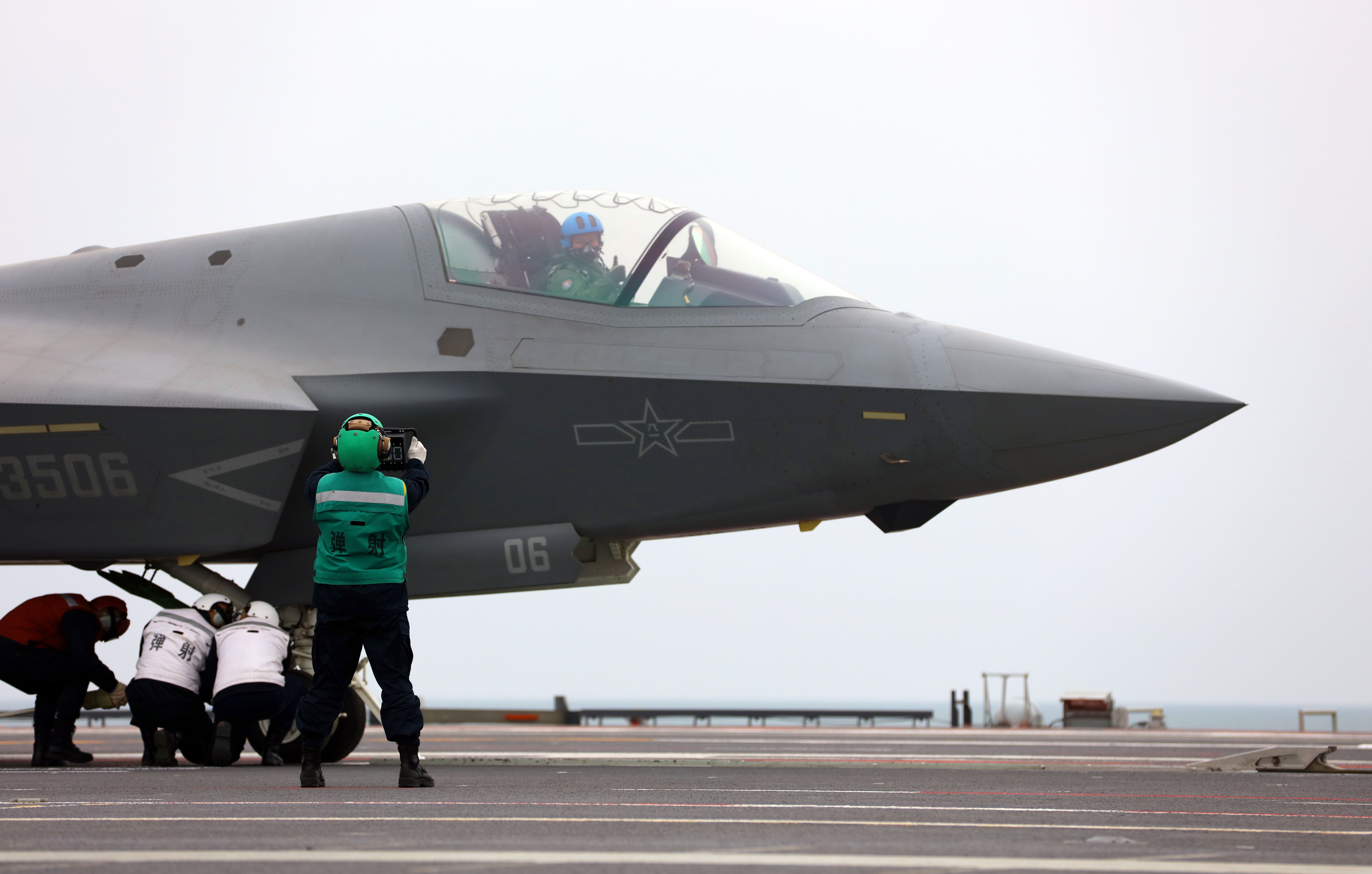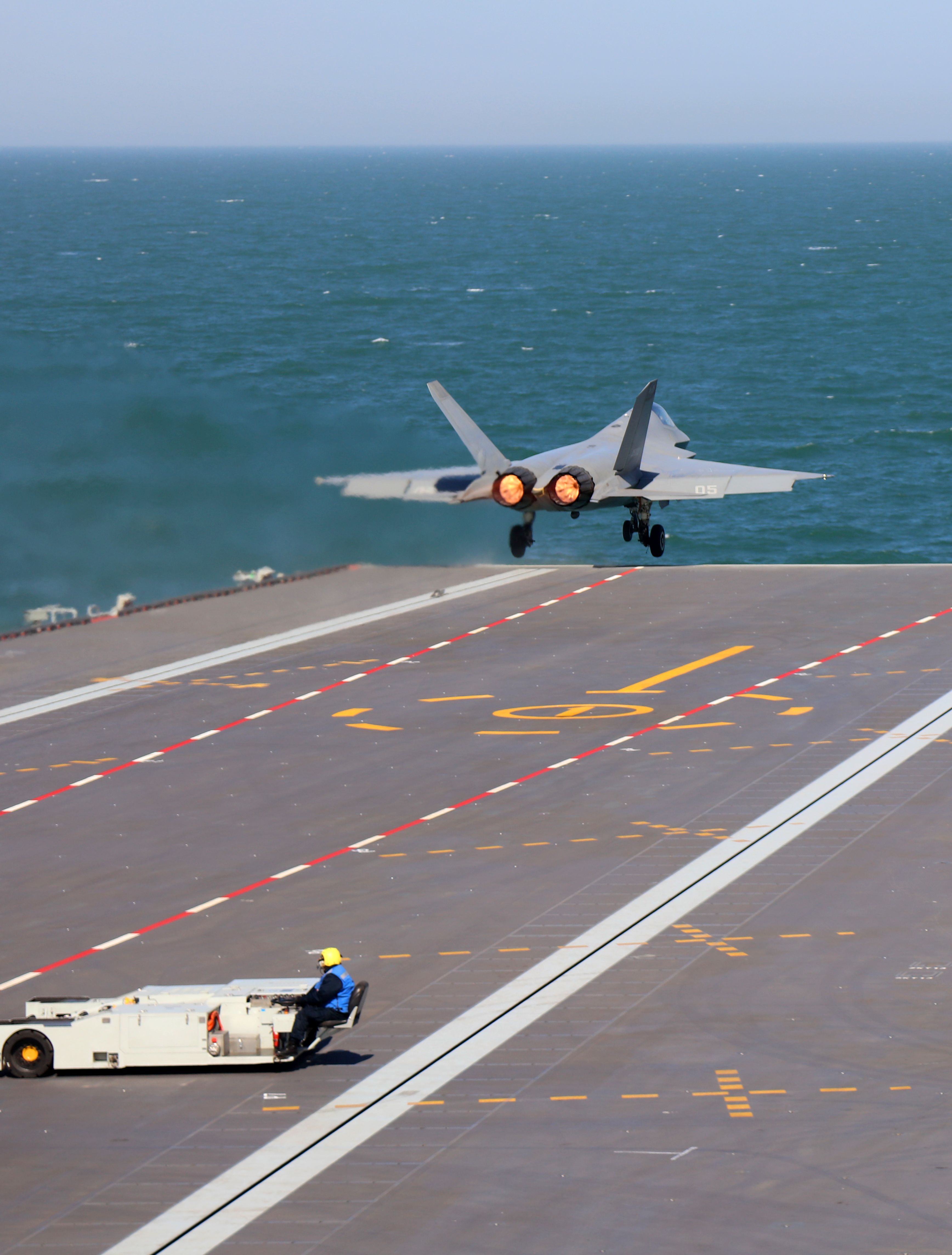 殲-35艦載戰鬥機在海軍福建艦開展觸艦復飛訓練。李唐 攝
