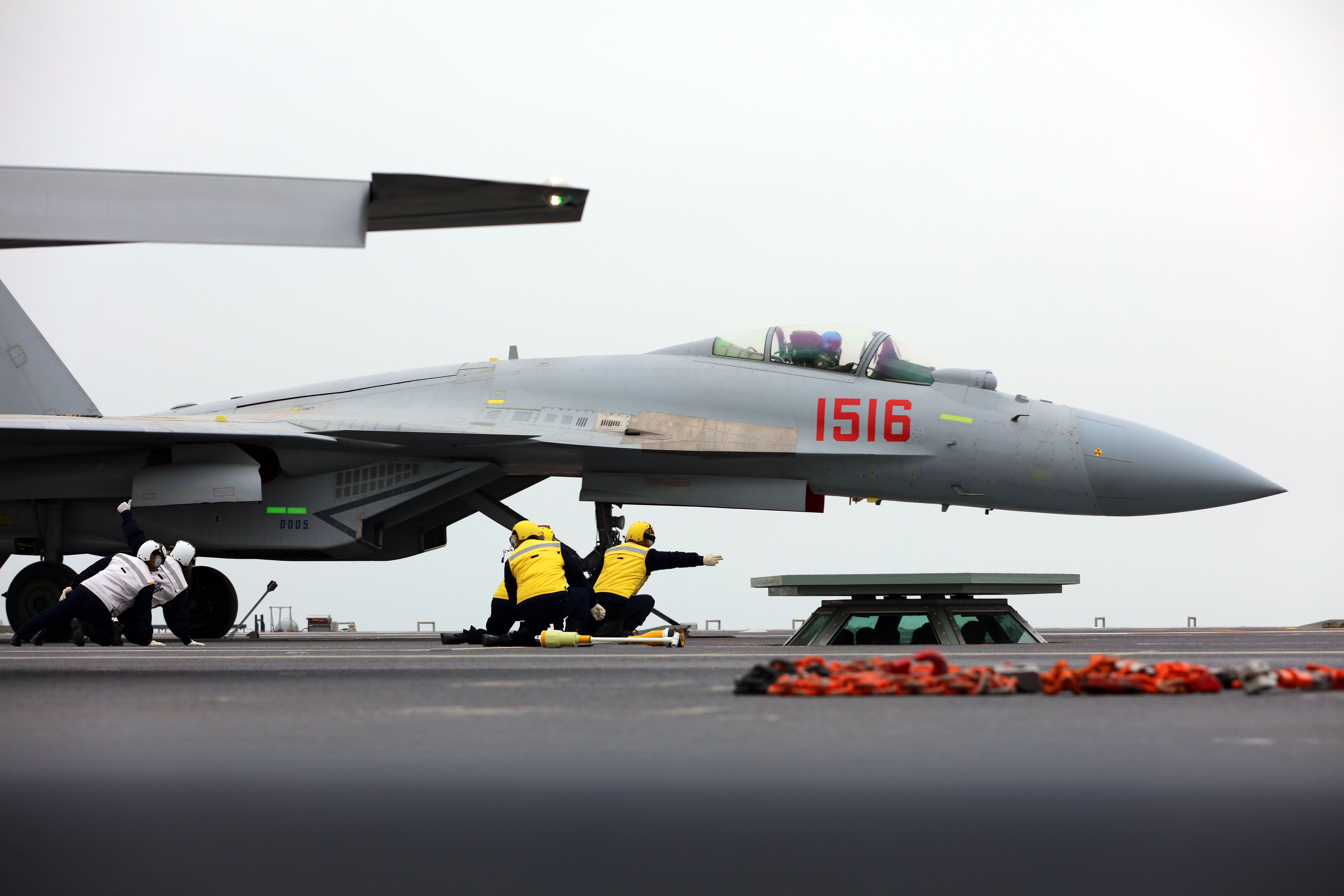 殲-15T艦載戰鬥機在海軍福建艦阻攔着艦。李唐 攝