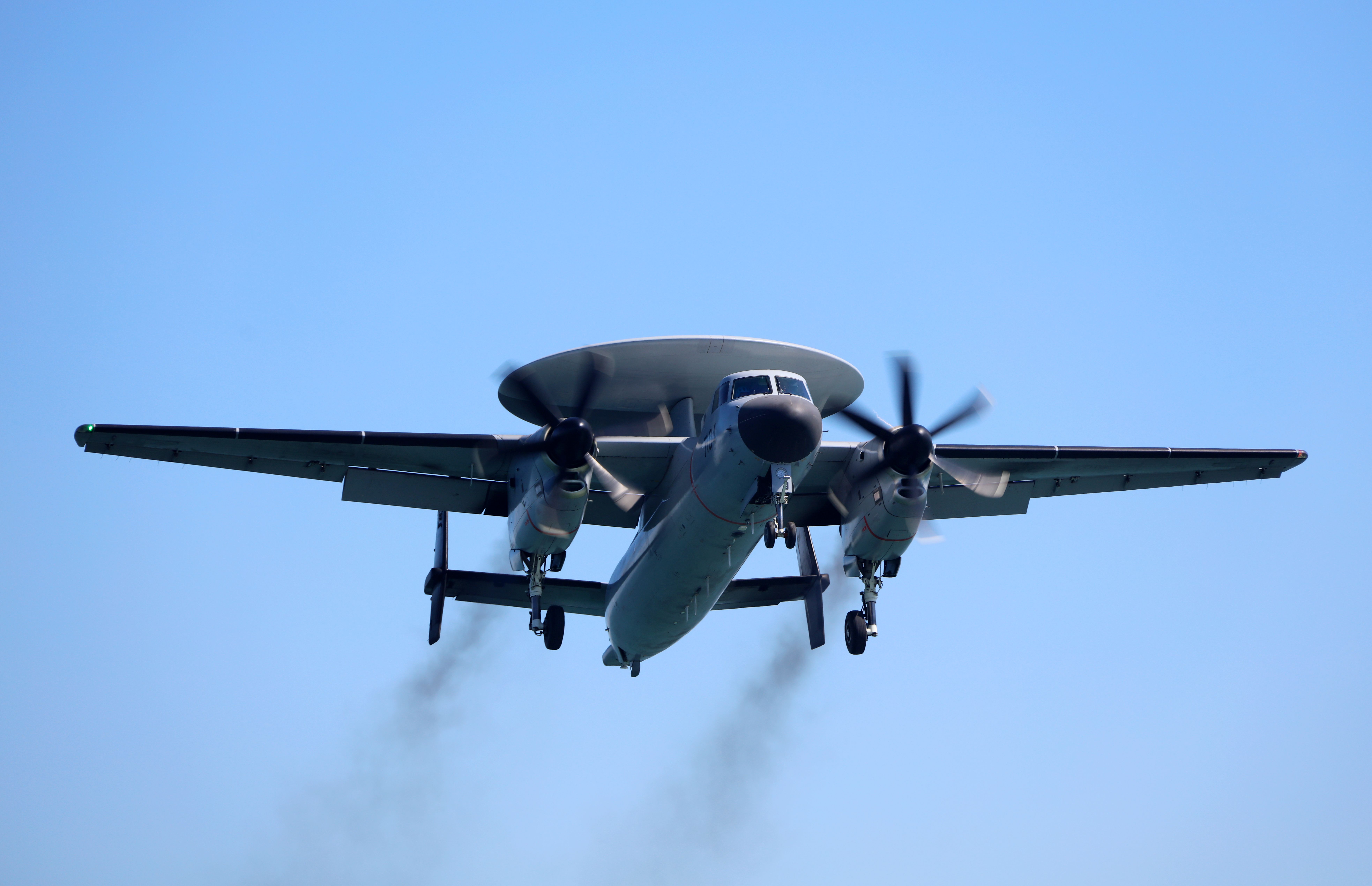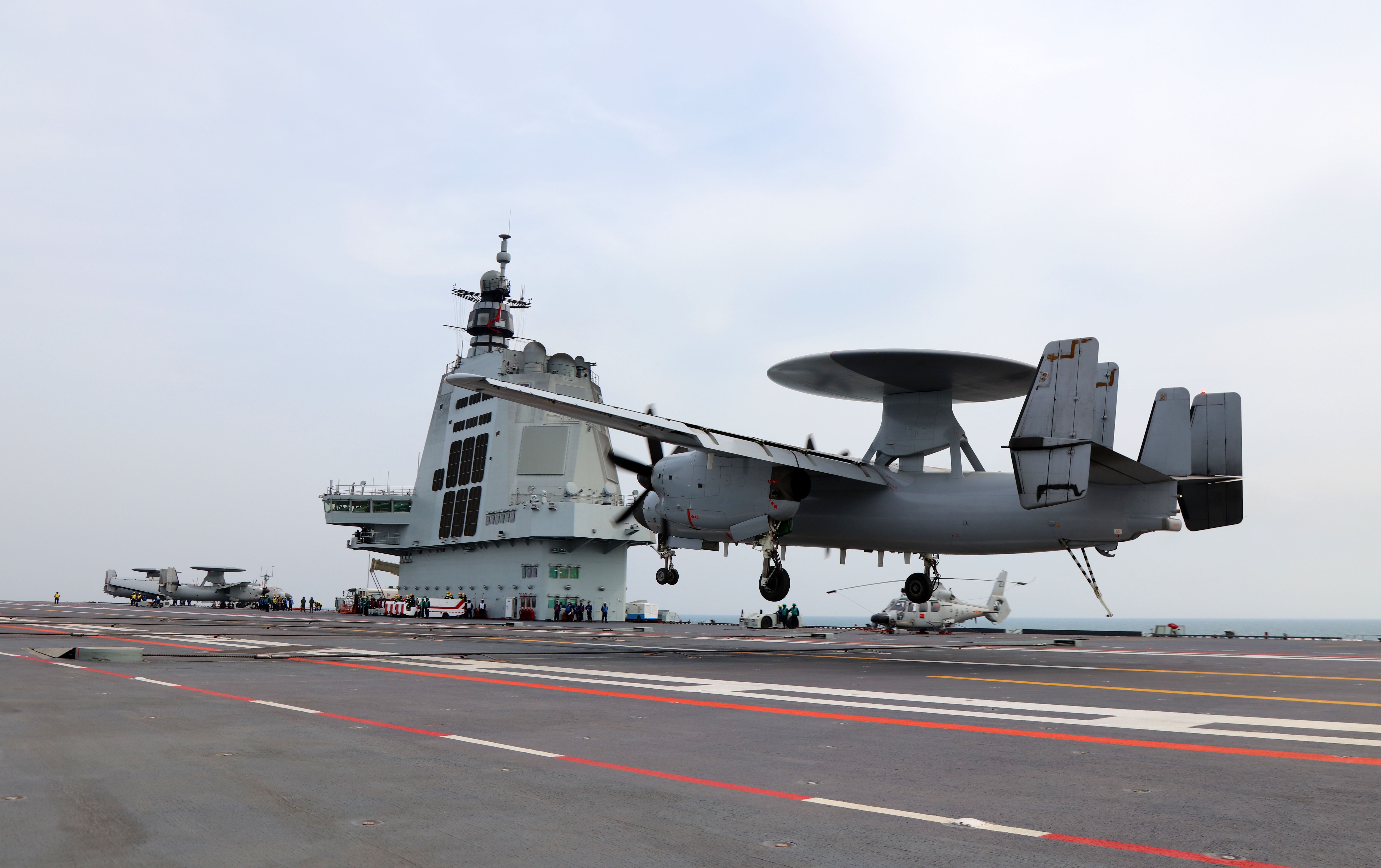 空警-600艦載預警機在海軍福建艦阻攔着艦。這是飛機着艦前一瞬間。李唐 攝