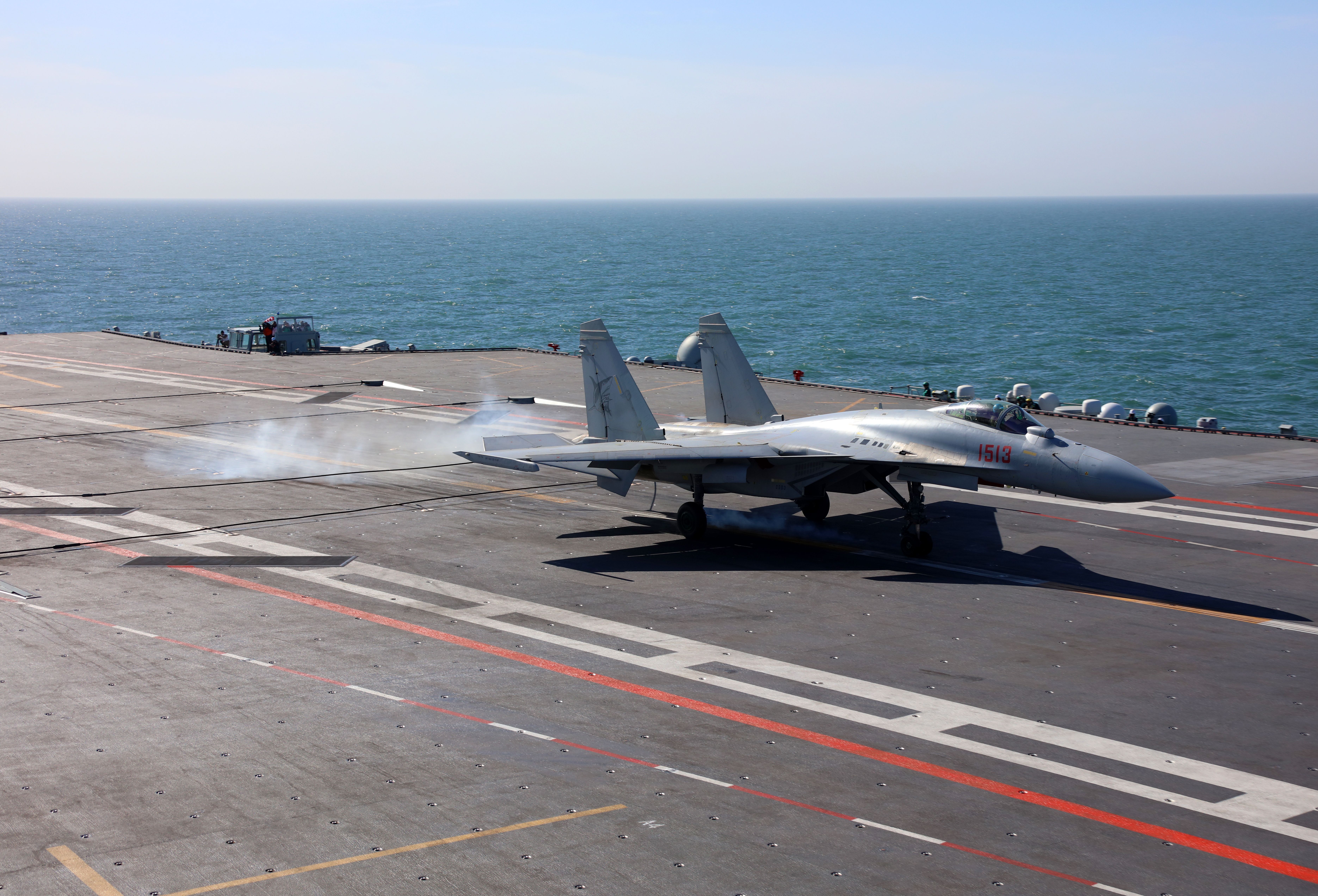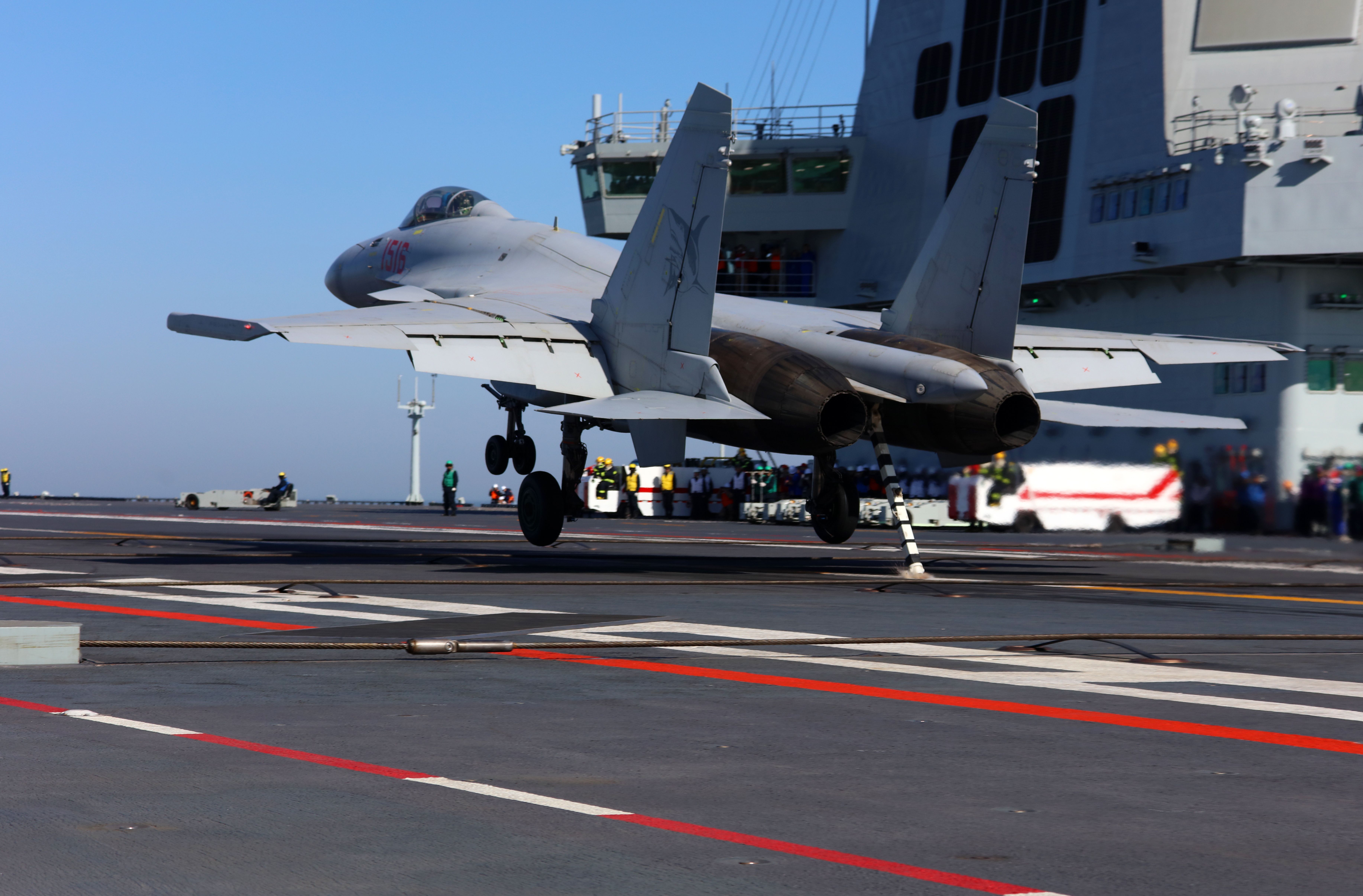 殲-15T艦載戰鬥機在海軍福建艦阻攔着艦。這是戰機着艦掛索瞬間。李唐 攝