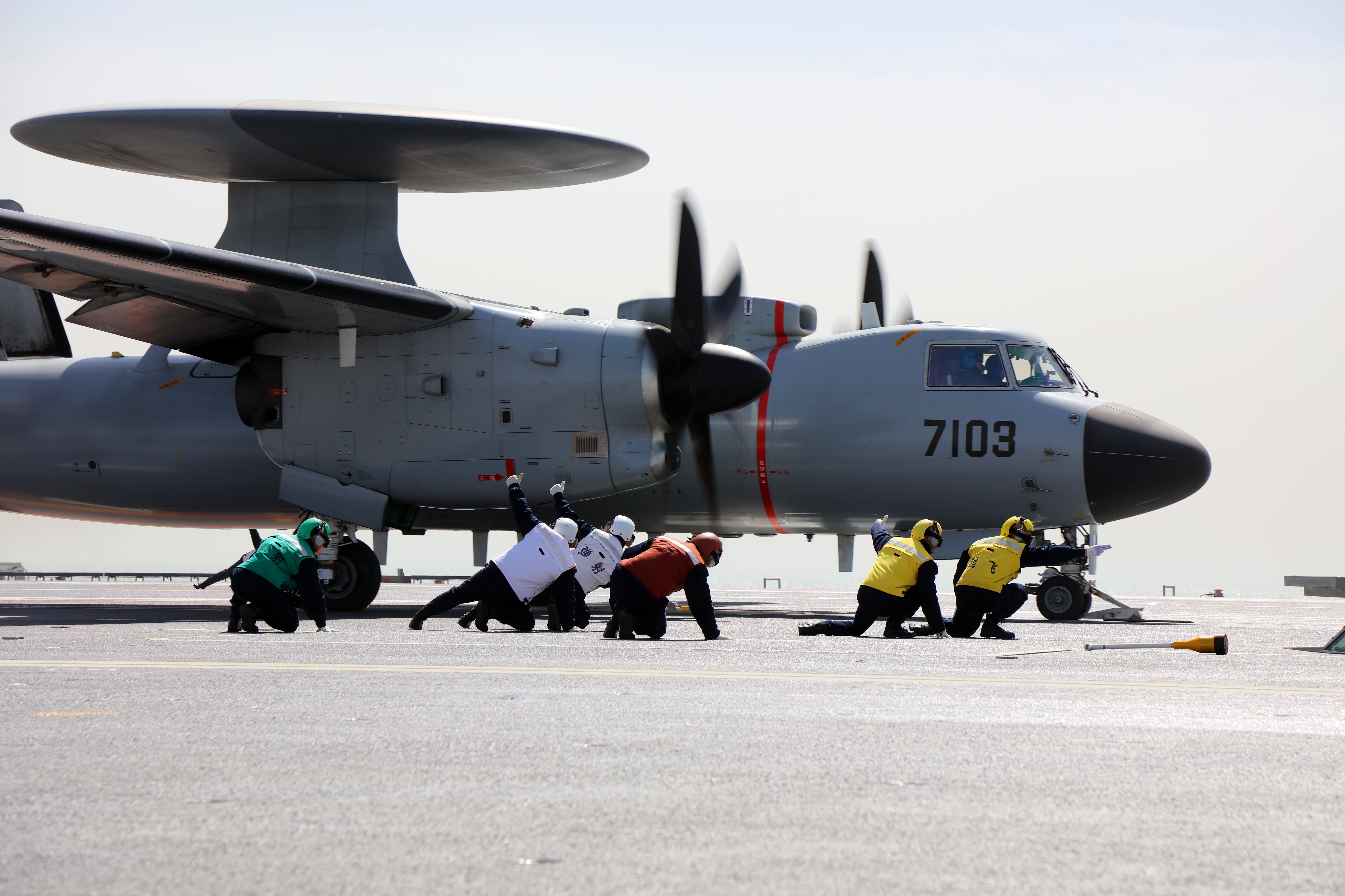 空警-600艦載預警機在海軍福建艦電磁彈射起飛前,放飛小組在引導戰機彈射入位。李唐 攝