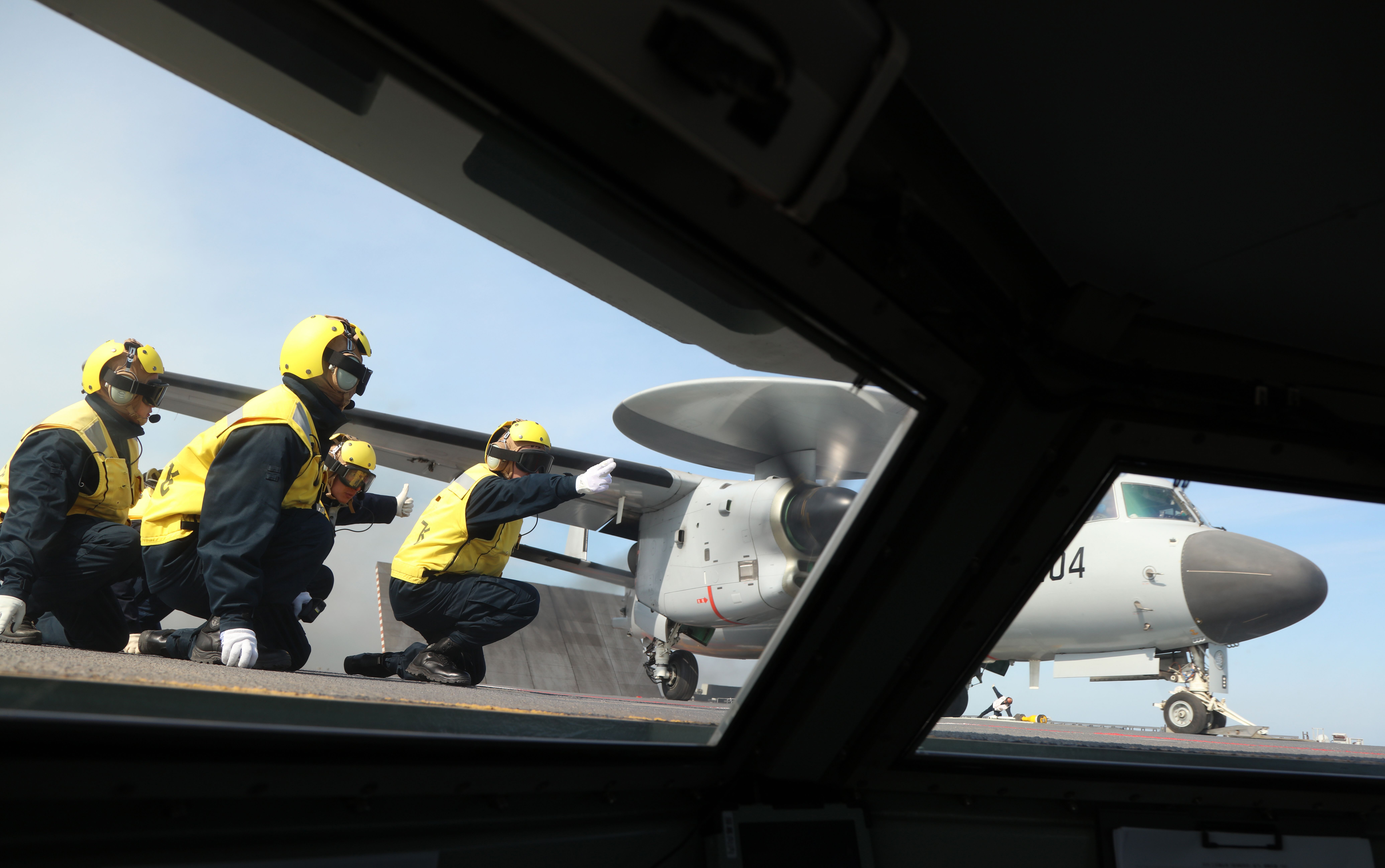 空警-600艦載預警機在海軍福建艦電磁彈射起飛。這是起飛助理做出放飛手勢。李唐 攝