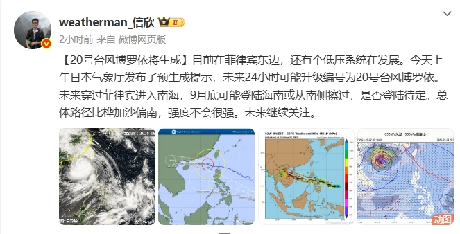據中國氣象頻道氣象分析師信欣,目前在菲律賓東邊,還有個低壓系統在發展。今天上午日本氣象廳發佈了預生成提示,未來24小時可能升級編號為20號颱風博羅依。未來穿過菲律賓進入南海,9月底可能登陸海南或從南側擦過,是否登陸待定。總體路徑比樺加沙偏南,強度不會很強。