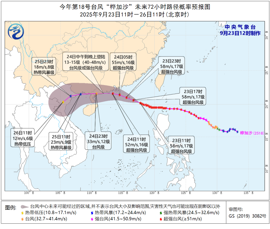 預計“樺加沙”未來向西偏北方向移動,將於明天(24日)在廣東一帶沿海登陸(強颱風級或超強颱風級)。