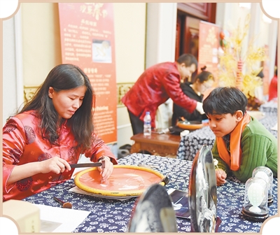 在平壤“歡樂春節”活動中,非遺傳承人(左一)現場展示瓷雕。