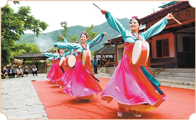 丹東市寬甸滿族自治縣下露河朝鮮族鄉三道河朝鮮族民俗村的小鼓舞表演。