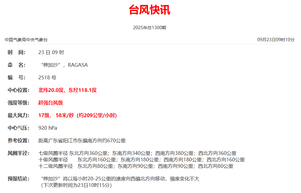 預計,其將以每小時20公里左右的速度向西偏北方向移動,將於24日在廣東深圳到徐聞一帶沿海登陸(強颱風級或超強颱風級,14~16級,45~52米/秒),登陸後轉向偏西方向移動,強度逐漸減弱。