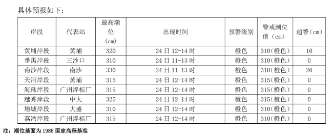 (4)重點防禦岸段需注意防範越浪引起水浸,局部岸段存在海水漫堤風險,海珠區侖頭和新洲碼頭段、黃埔區長洲島以及珠江沿岸未做好防潮準備的企業碼頭岸段可能因風暴潮漫堤發生較大面積的水淹。
