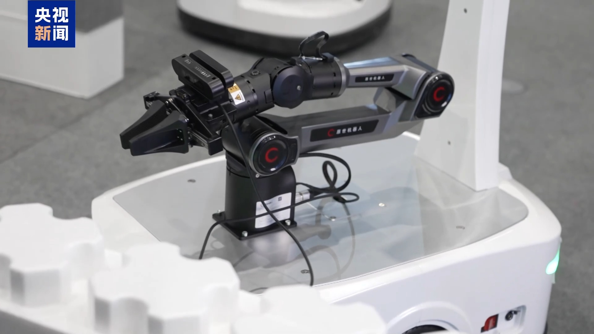 在自主移動機器人賽項記者看到,隨着一串代碼輸入,幾台機器人揮動機械臂,抓取、抬升,一件件模擬水果被快速摘下運送到指定地點。