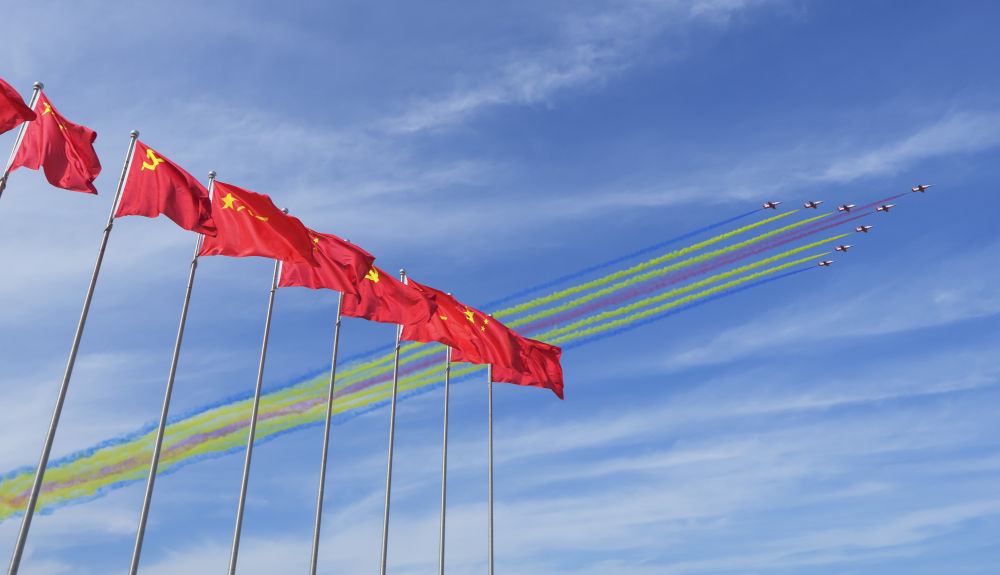 ↑9月19日,殲-20四機編隊進行機動飛行展示。新華社記者 顏麟藴 攝