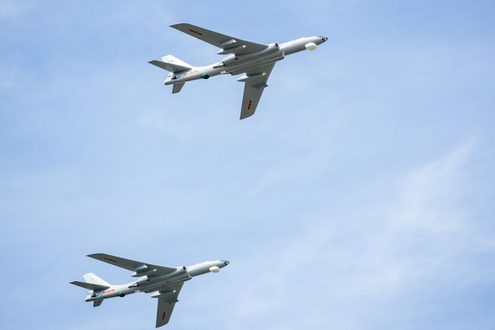 ↑9月19日,轟-6雙機編隊進行飛行展示。新華社記者 張楠 攝