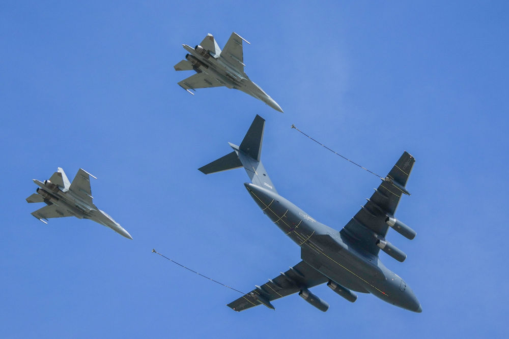 ↑9月19日,運油-20A和殲-16編隊通場。新華社記者 顏麟藴 攝