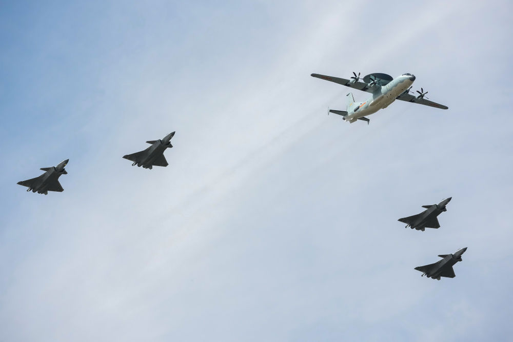 ↑9月19日,2025年空軍航空開放活動和長春航空展上,空警-500和殲-20編隊通場。新華社記者 張楠 攝