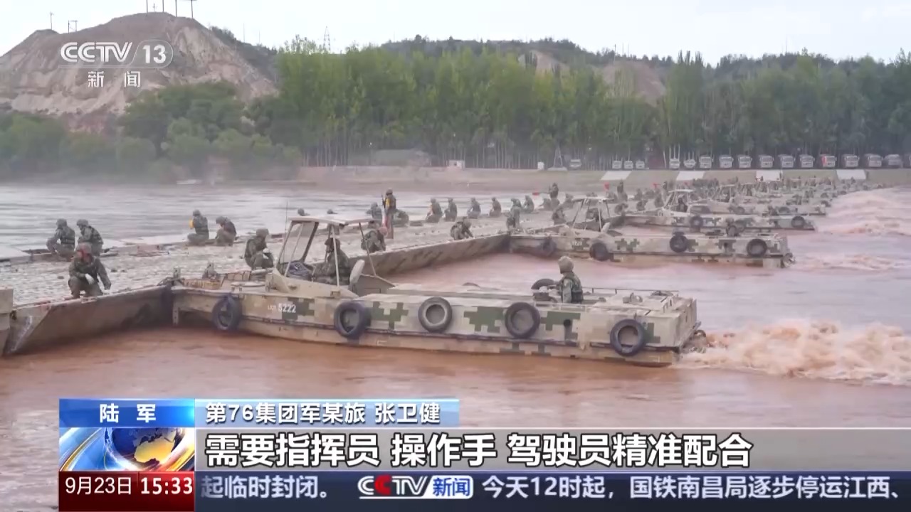 *第76集團軍某旅 張衞健:*浮橋架設時通過汽艇牽引或頂推,使門橋順利進入橋軸線,再調整兩個橋段的距離,使浮橋能夠順利合攏。這是一系列環環相扣的動作,需要指揮員、操作手、駕駛員精準配合,高效協同。