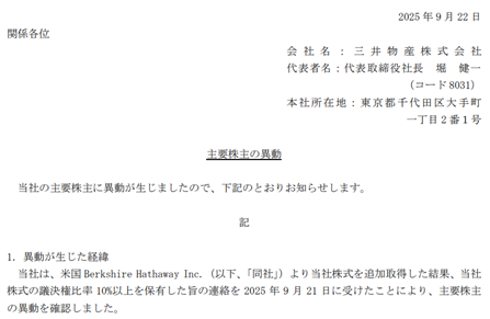 【環球網財經綜合報道】9月22日,三井物產週一公告披露,伯克希爾已成為公司大股東,其在三井物產的投票權持股比例提升至10%以上,並可能繼續增持。在此之前,巴菲特在今年2月致股東信中表示,伯克希爾原計劃將三井物產持股比例控制在10%以內,但相關公司已同意適度放寬限制。