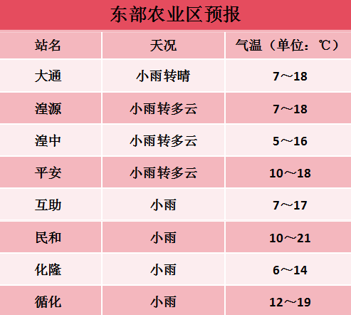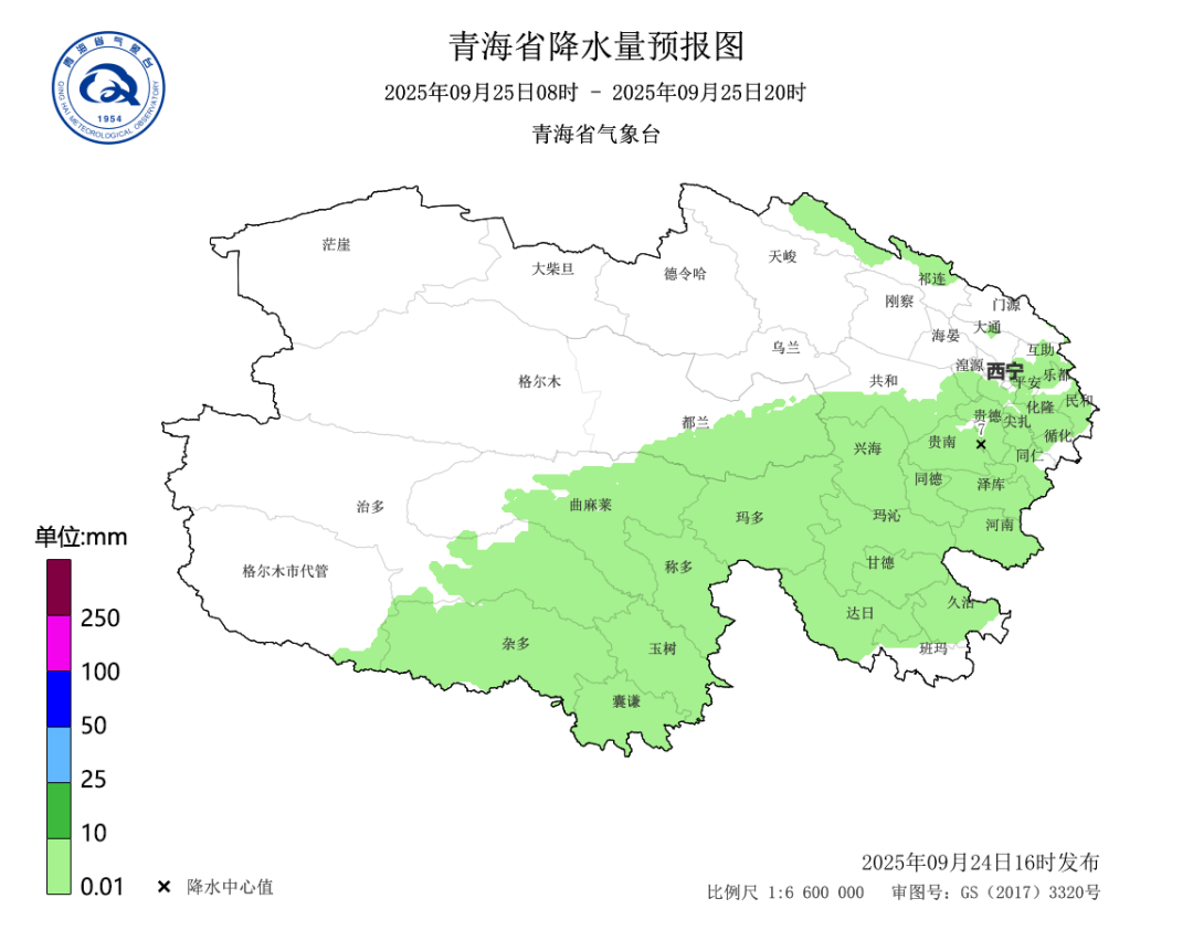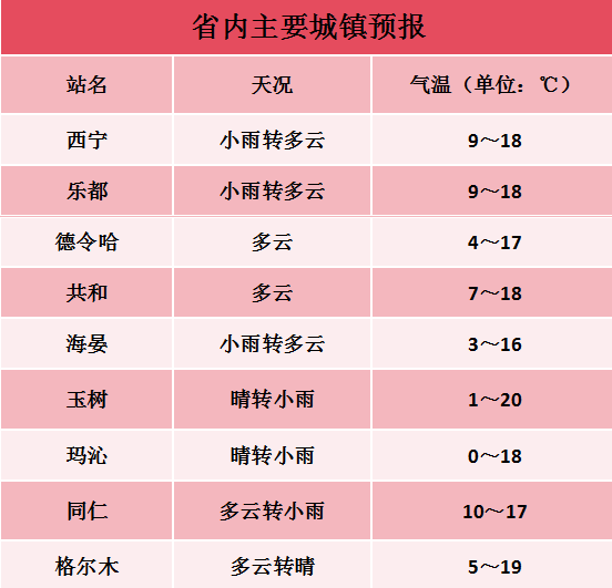 25日20時至26日20時:西寧、海東、海南大部、海北大部、玉樹大部、果洛、黃南及都蘭的部分地區有小雨或陣雨及以上量級降水(0.1~19毫米),其中化隆、循化、貴德、尖扎的部分地區有中雨(10~24毫米),高海拔地區有小到中雪(0.1~3毫米),省內其餘地區晴或多雲。海西西部、玉樹大部有5~6級偏西風,陣風7級以上。