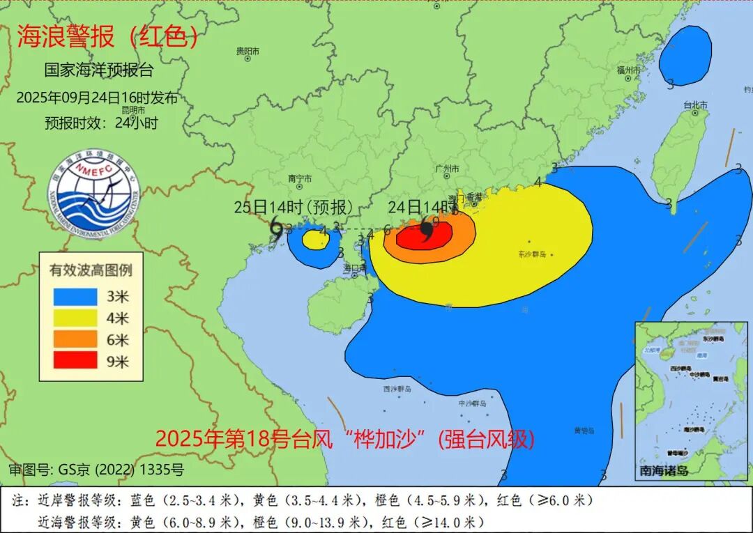 預計9月24日下午到25日下午,南海西北部將出現7到10米的狂浪到狂濤區,南海東北部將出現4到6米的巨浪到狂浪區,北部灣將出現3到4.5米的大浪到巨浪區,近海海域海浪預警級別為橙色;廣東西部近岸海域將出現4到7米的巨浪到狂浪,該近岸海域海浪預警級別為紅色,廣東東部近岸海域將出現3到5米的大浪到巨浪,該近岸海域海浪預警級別為橙色,海南東部、北部、廣西近岸海域將出現2.5到3.5米的大浪,該近岸海域海浪預警級別為黃色,福建、浙江南部近岸海域將出現1.5到2.5米的中浪到大浪,該近岸海域海浪預警級別為藍色。請在上述海域作業的船隻注意安全,沿海各有關單位提前採取防浪避浪措施。