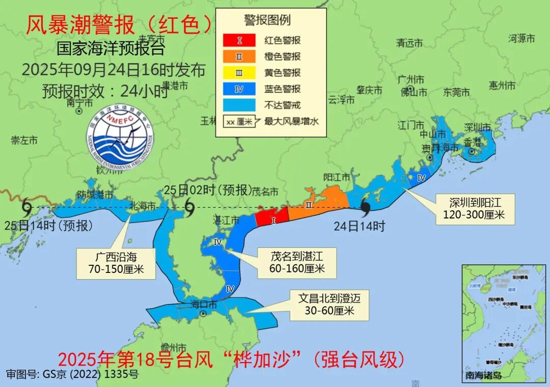 受今年第18號颱風“樺加沙”的影響,預計24日下午至25日夜間,廣東深圳到陽江沿海將出現120到300釐米的風暴增水,廣東茂名到湛江沿海將出現60到160釐米的風暴增水,海南文昌北到澄邁沿海將出現30到60釐米的風暴增水,廣西沿海將出現70到150釐米的風暴增水。廣東省茂名市的風暴潮預警級別為紅色,廣東省陽江市的風暴潮預警級別為橙色,廣東省珠海市和湛江市的風暴潮預警級別為藍色。廣東省茂名市電白區沿海低窪地區在25日凌晨前後海水倒灌風險高;廣東陽江市江城區和陽東區沿海低窪地區在24日傍晚前後海水倒灌風險較高。