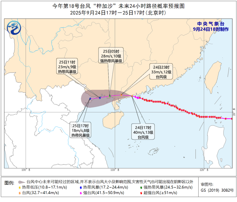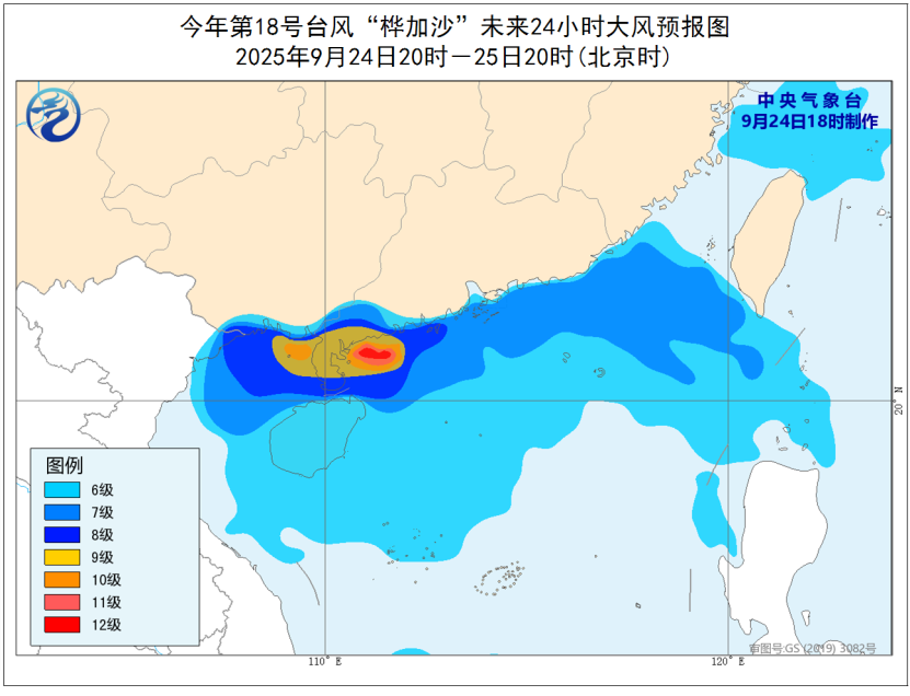 大風預報:24日20時至25日20時,巴士海峽、南海北部和中西部、西沙羣島、東沙羣島、東海南部、北部灣、瓊州海峽、福建南部沿海、廣東沿海及西南部地區、珠江口區、海南島沿海、廣西沿海將有6-7級大風、陣風8-9級,其中,廣東西部地區及沿海、廣西沿海風力有8-10級、陣風11-12級,颱風中心經過的附近海域或地區風力可達11-12級、陣風13-14級。