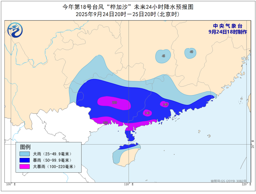 降水預報:24日20時至25日20時,廣東大部、廣西大部、海南島北部和西部、貴州南部、雲南東南部、江蘇中部等地有大到暴雨,其中,廣東中南部、廣西中南部、江蘇中部等地部分地區有大暴雨(100~220毫米)。