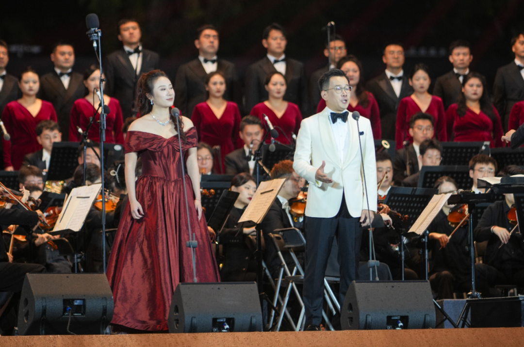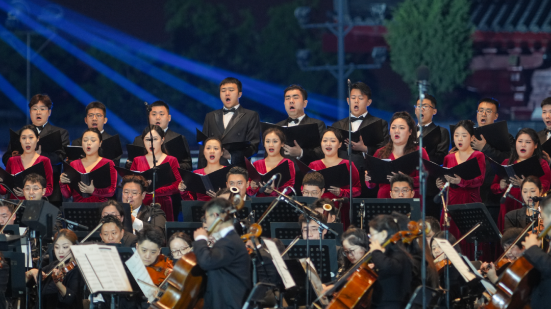 活動當天,肖斯塔科維奇《節日序曲》以慷慨澎湃的旋律揭開序幕,奏響對祖國的頌歌;任同祥創作的國粹經典《百鳥朝鳳》以嗩吶再現百鳥和鳴、鳳凰展翅的盛景;柴可夫斯基《1812序曲》在現場炮聲中震撼全場,將情緒推向頂點。石倚潔的《我住長江頭》與《我和我的祖國》唱出了深沉的家國情懷,全場觀眾揮舞國旗齊聲合唱,讓大雁塔廣場成為最動人的舞台。