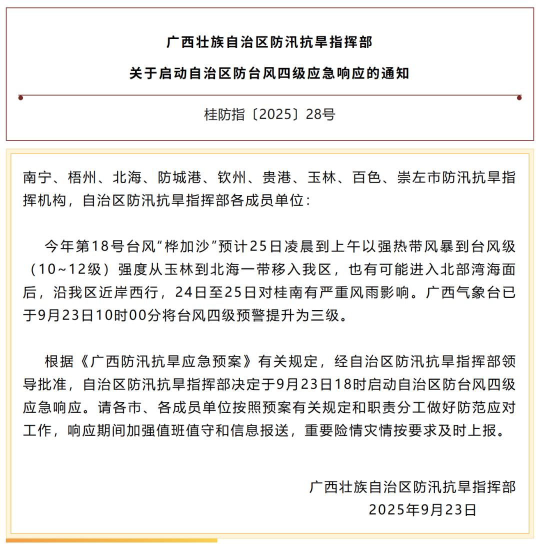 記者從應急管理部獲悉,國家防汛抗旱總指揮部決定於23日對廣西啓動防汛防颱風四級應急響應。