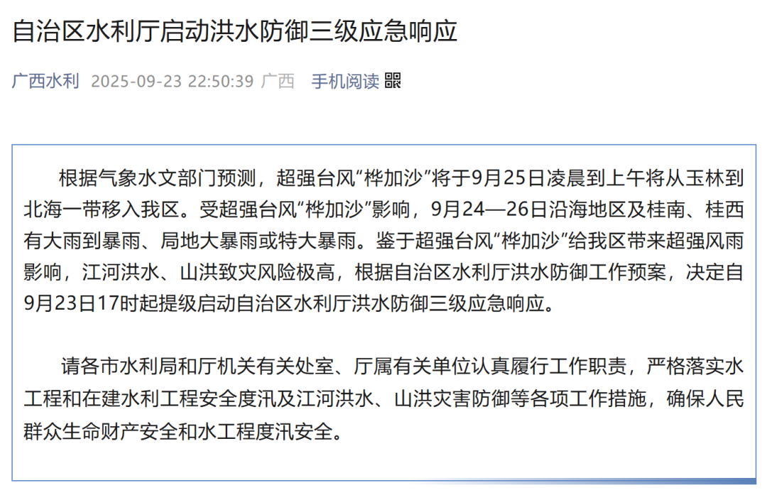 國家防總對廣西啓動防汛防颱風四級應急響應 水利部對廣西等3省份啓動洪水防禦Ⅳ級應急響應