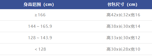 根據身高選擇合適書包尺寸(表1),身高144釐米以下的,可選擇配有腰帶和胸帶的書包,分散重力,防止書包晃動過大造成脊柱傷害。