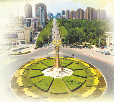 位於包頭市中心的“三鹿騰飛”雕塑,小麗花在雕塑周圍燦爛綻放。
