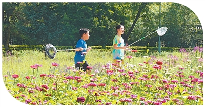 包頭市阿爾丁植物園,小朋友們在小麗花叢中玩耍。
